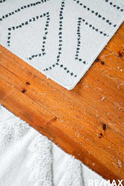 - Olohuoneessa ja siihen isolla oviaukolla yhdistetyssä houneessa on lautalattia ja maalatut seinät seinät.