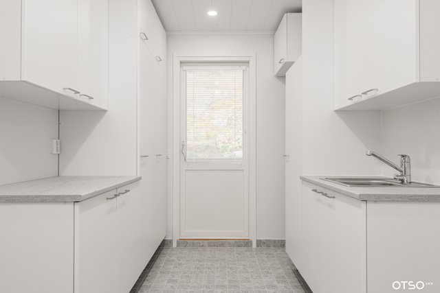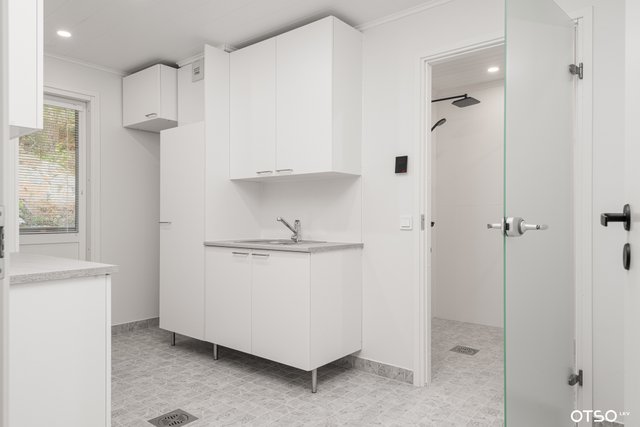 - Pesukone, pesukoneliitäntä, kuivausrumpu, pyykkikaapit, lattialämmitys, lattiakaivo, pöytätaso, lastenhoitopöytä/taso, ja pesuallas