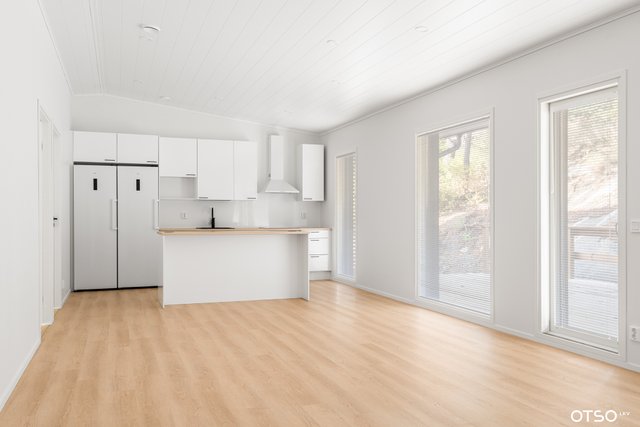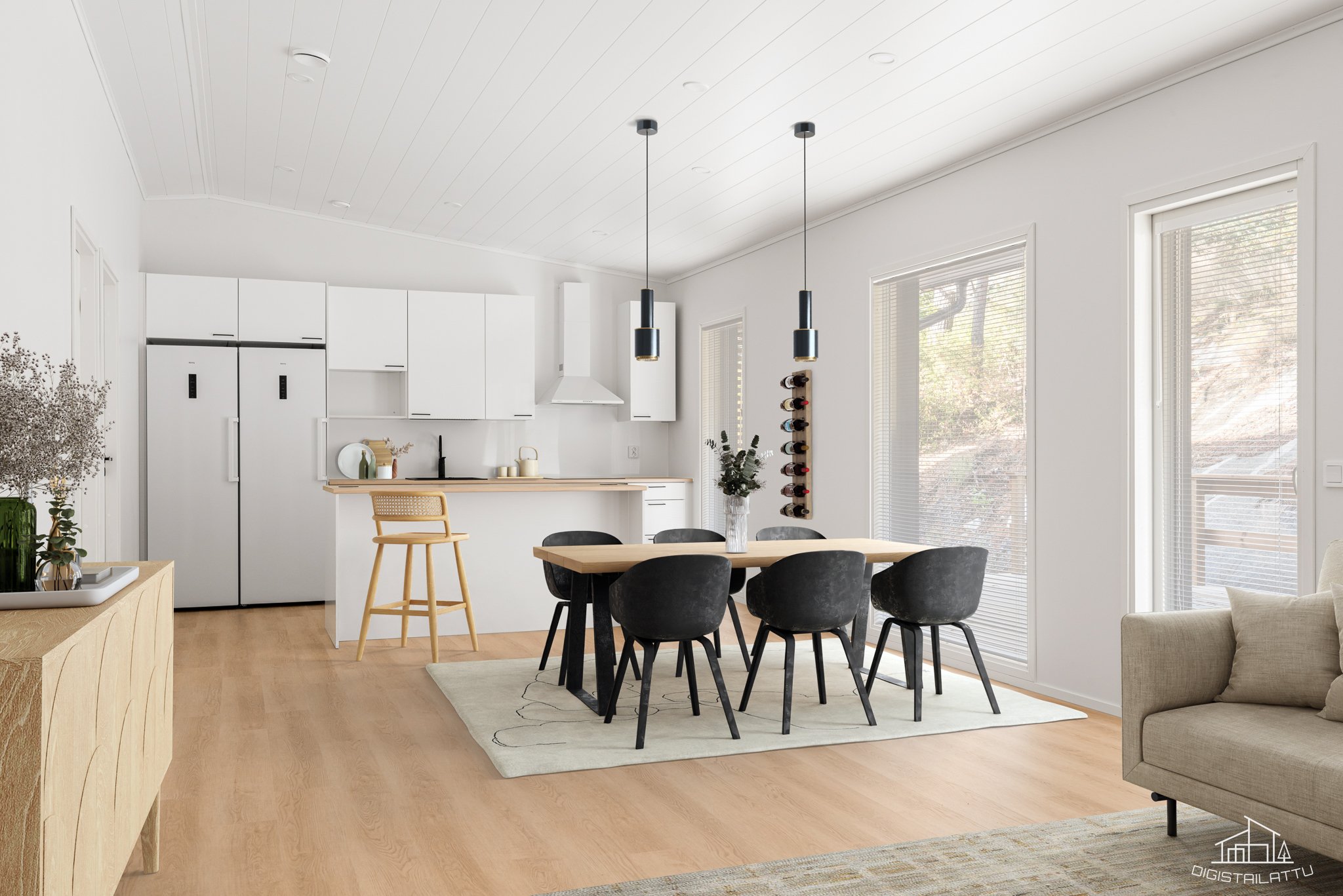 Upea keittiö ja olohuone, hyvin mahtuu kaikki huonekalut ja tila ikään kuin jatkuu hulppean kokoiselle terassille.