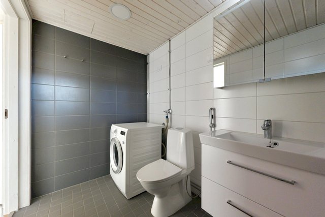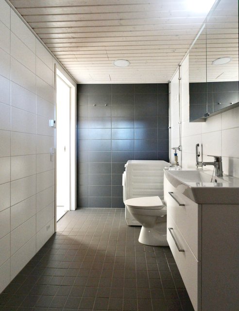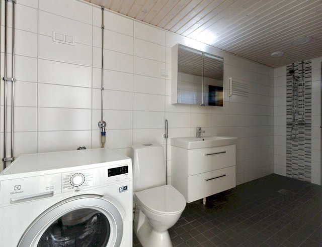 - VARUSTUS: Suihku, WC-istuin, Allaskaapisto, Hana, Peilikaappi, Lattialämmitys, Pesukoneliitäntä. SEINÄT: Kaakeli. LATTIA: Laatta.