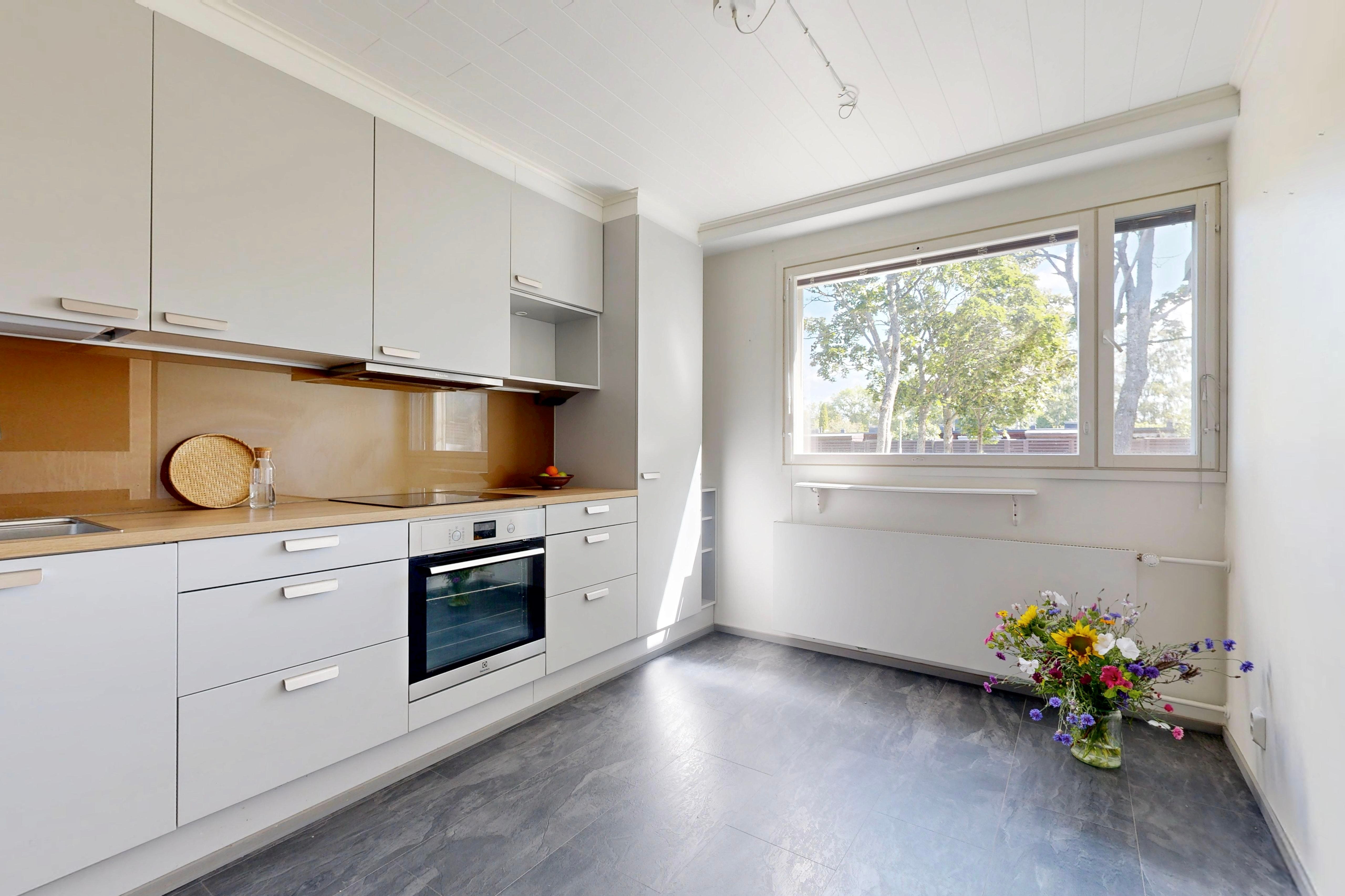 Tämä koti ihastuttaa tunnelmallaan. Olohuoneeseen astuttaessa tila saa huokaisemaan. Isot ikkunat tuovat valoa ja avaruutta. Olohuoneesta löytyy takka sekä käynti asunnon terassille. Keittiössä on valkoiset kaapistot, hyvin säilytys-ja laskutilaa sekä tilaa ruokailuryhmälle.