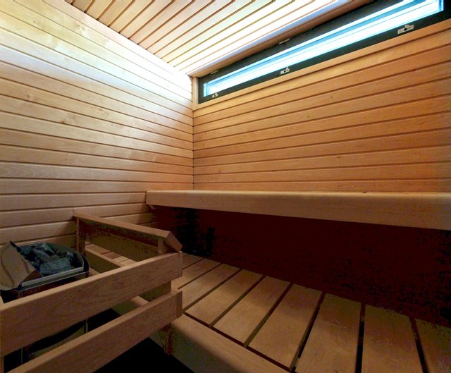 - VARUSTUS: Sähkökiuas, Lauteet. SEINÄT: Puu. LATTIA: Laatta.