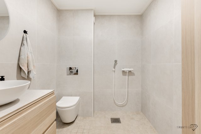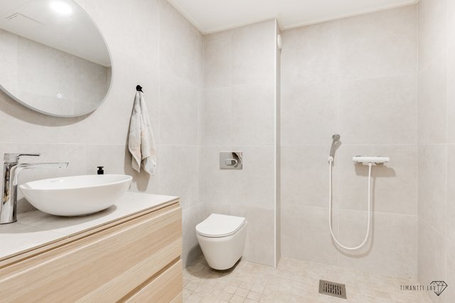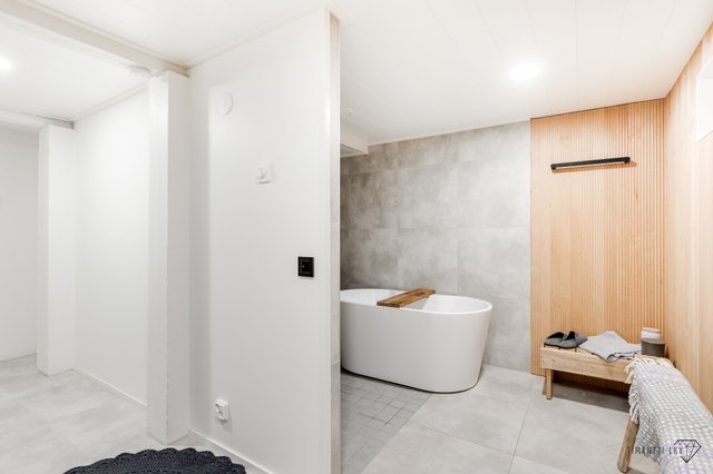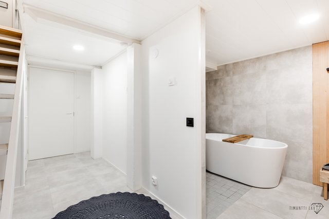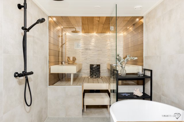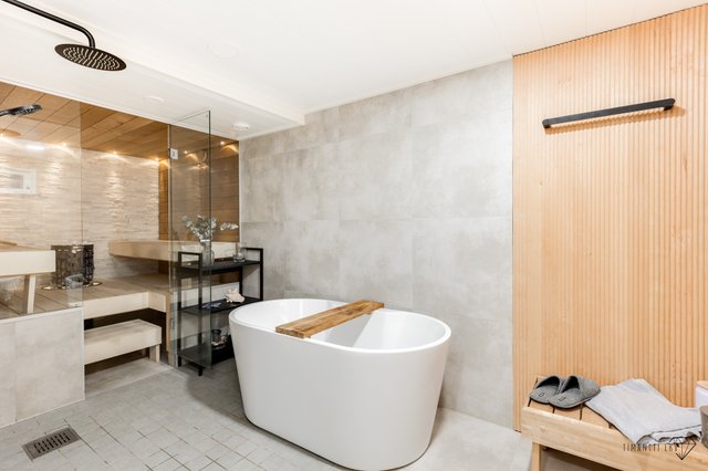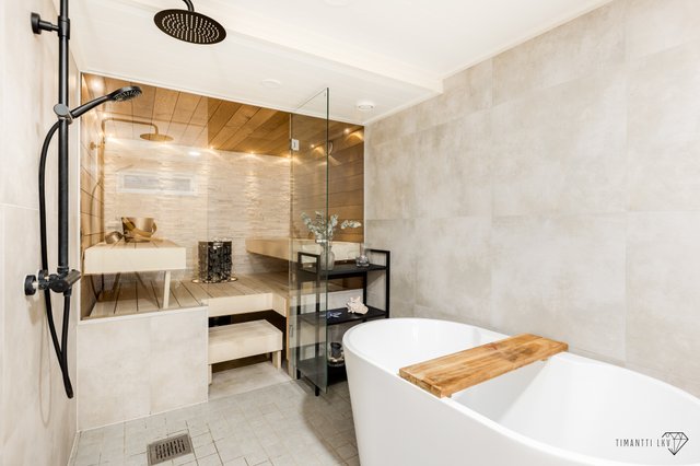 - Kodin yläkerrasta löytyy upeasti vuonna 2022 uusittu pesuhuone, jossa suuret seinälaatat 60cm x 60cm tekevät tilasta ajattoman ja modernin. Tästä tilasta löytyy myös seinä wc ja käsienpesuallas erillisellä allaskaapilla. Kellarissa on näyttävä ja arkeen luksusta tuova oma spa-osasto, joka on uusittu myös kokonaan vuonna 2022. Katseenvangitsijana tilassa ihana amme sekä näyttävä sauna lasiseinän kera. Sadesuihkun alla kelpaa rentoutua.