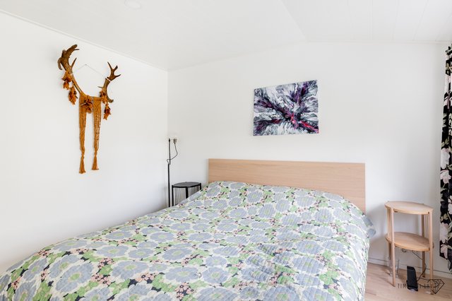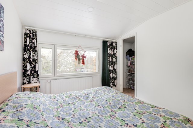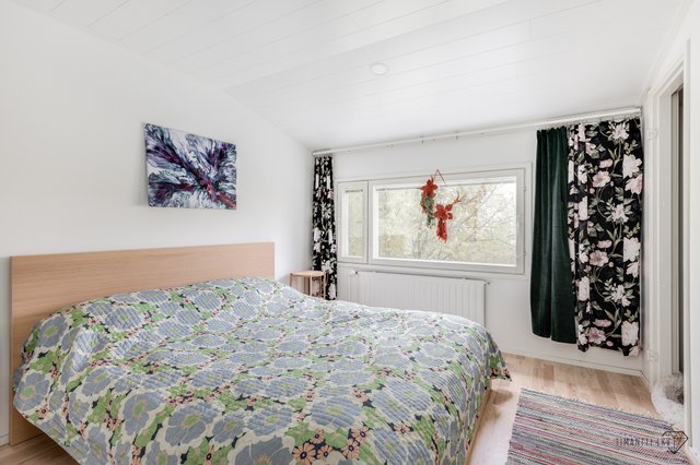 Kodin kaksi makuuhuonetta sijaitsevat yläkerrassa, jossa toisessa on erillinen vaatehuone. Yläkerrassa sijaitsee myös kodin toinen kylpyhuone, joka on kaunis kokonaisuus. Vuonna 2024 asennettu ilmalämpöpumppu viilentää mukavasti kesäisin.