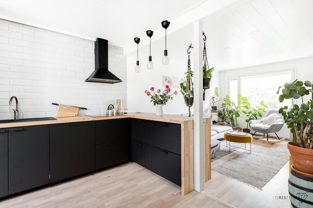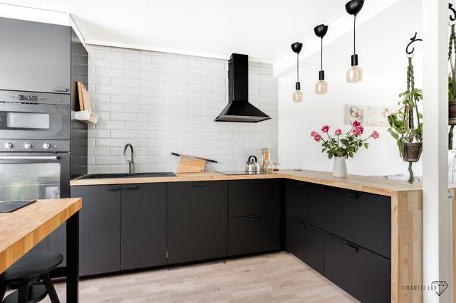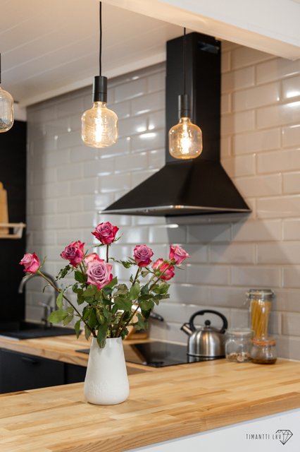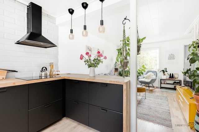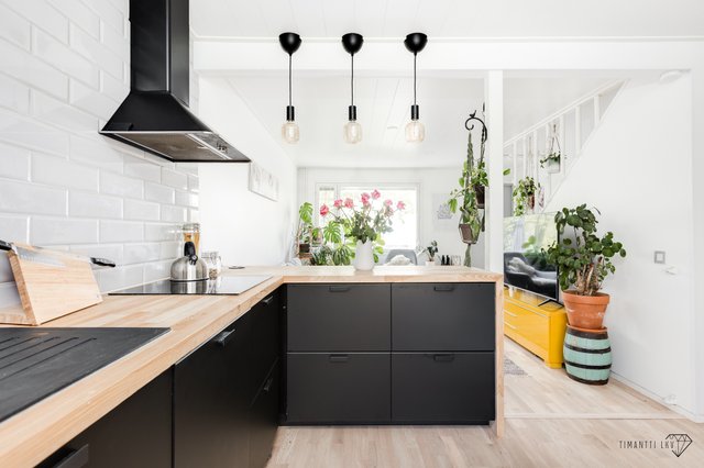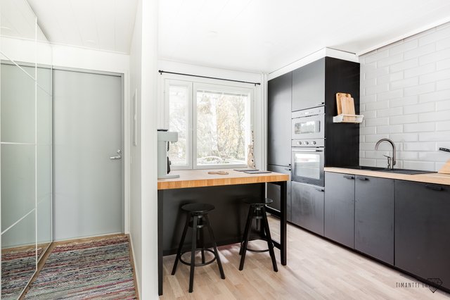 - Näyttävä ja modernisti vuonna 2022 uusittu musta keittiö kokonaisuus hurmaa heti kotiin sisään astuessa. Keittiöstä löytyy kaikki tarpeellinen ja upeat puutasot viimeistelevät tyylikkään tilan.