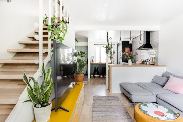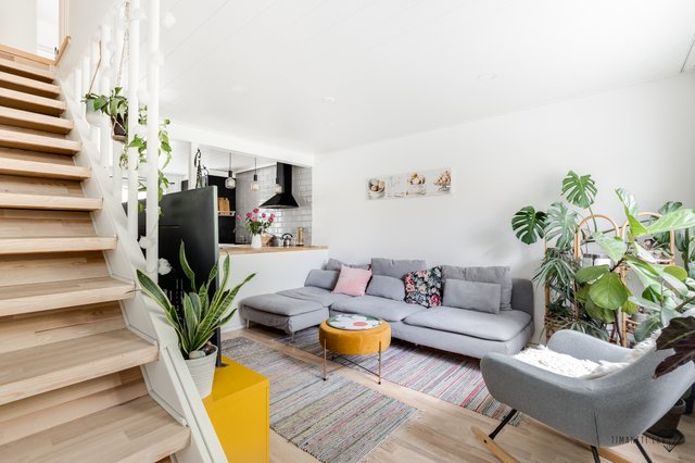 - Valoisa ja mukavan kokoinen olohuone sijaitsee kodin ensimmäisessä kerroksessa. Olohuoneen kautta kulku takapihalle sekä terasille kuin myös yläkertaan johdattaville portaille. Olohuone yhdistyy avaraksi tilaksi yhdessä keittiön kanssa.