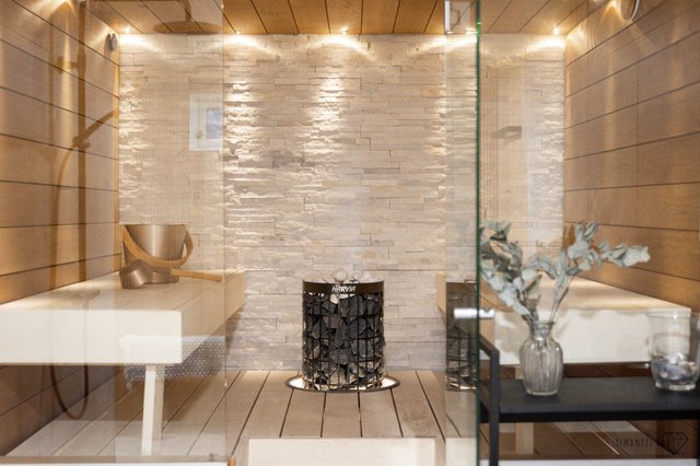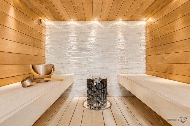 - Kaunis ja laadukkaasti toteutettu sauna, jossa kelpaa rentoutua isommallakin porukalla. Näyttävä Harvian pilarikiuas ja takaseinän laatoitus luovat saunaan ihan oman tunnelman. Panelointi seinissä ja lauteissa lämpökäsiteltyä haapaa.