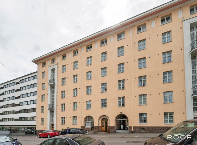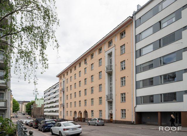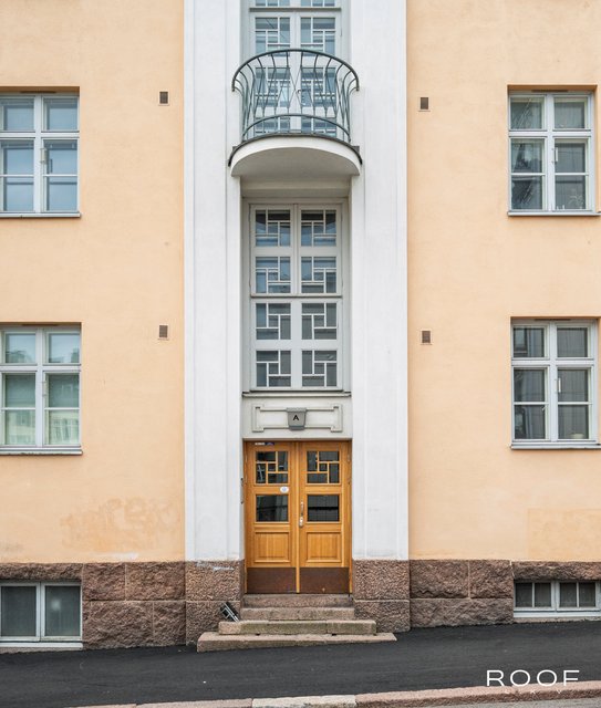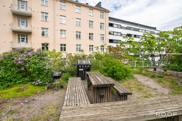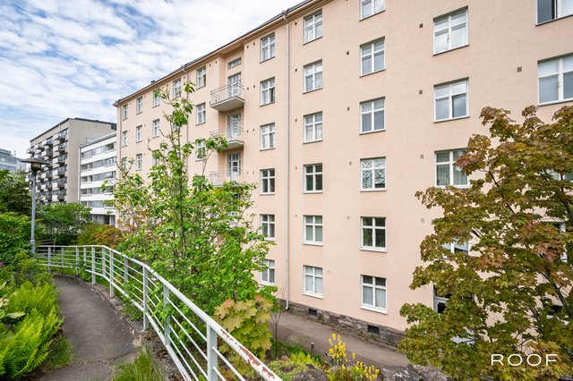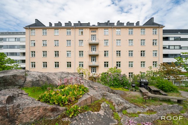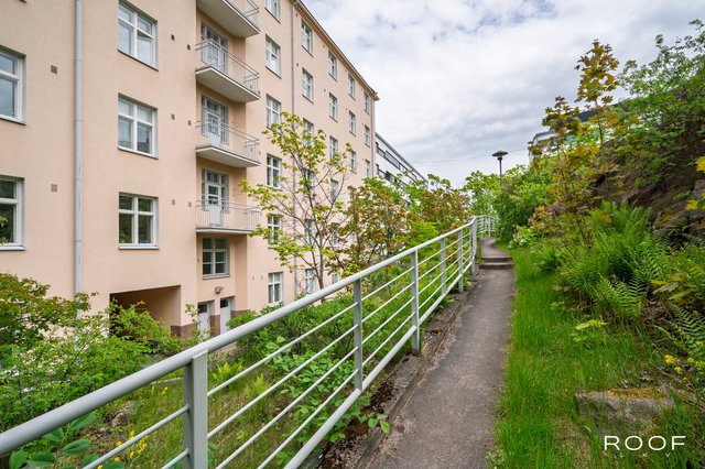 Kaunis vuonna 1929 rakennettu talo tarjoaa kattavat palvelut arkeen: hissi vie sujuvasti kolmanteen kerrokseen, ja yhtiöstä löytyy sauna, talopesula, vinttikomero sekä kaapeli-tv. Vehreällä sisäpihalla on ylhäällä kallioilla tunnelmallinen grillipaikka ja pyykkinarut.