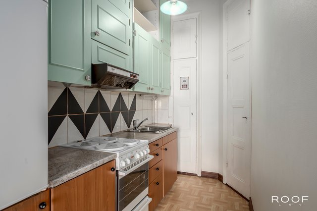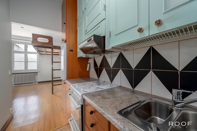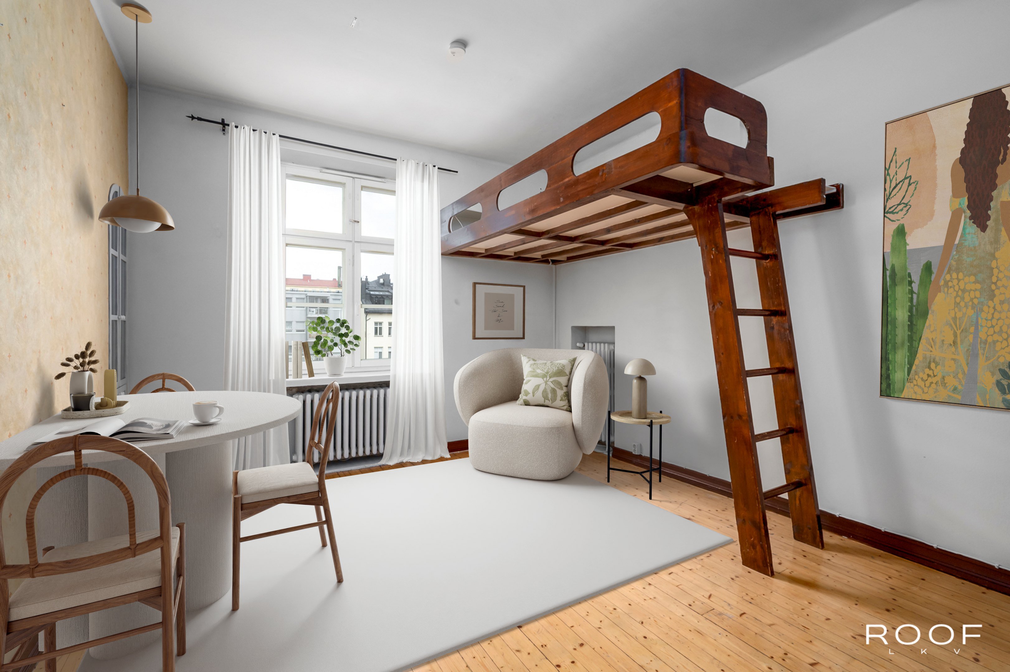 Tässä hurmaavassa yksiössä yhdistyvät tunnelma, avaruus ja valo. Korkea huonetila, suuret ikkunat leveine ikkunalautoineen ja lautalattiat ovat voittamaton yhdistelmä. Asunto on haluttu säilyttää mahdollisimman alkuperäisessä kunnossa – keittiön veikeät yksityiskohdat ja kauniit kaapistot henkivät menneen ajan charmia. Tukeva parvi tuo lisätilaa ja mahdollistaa tehokkaan tilankäytön.