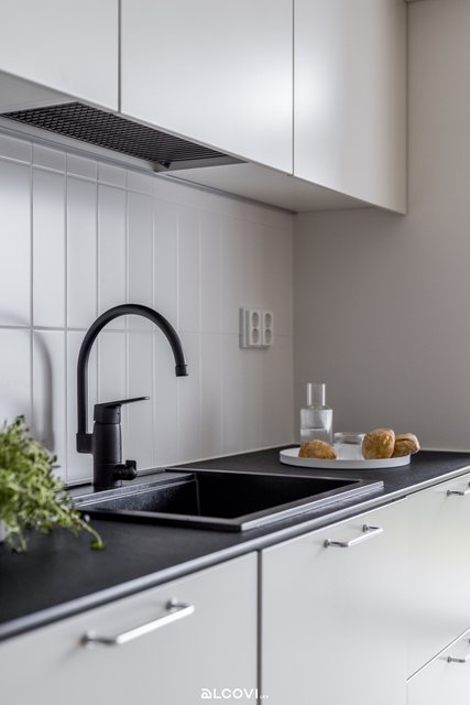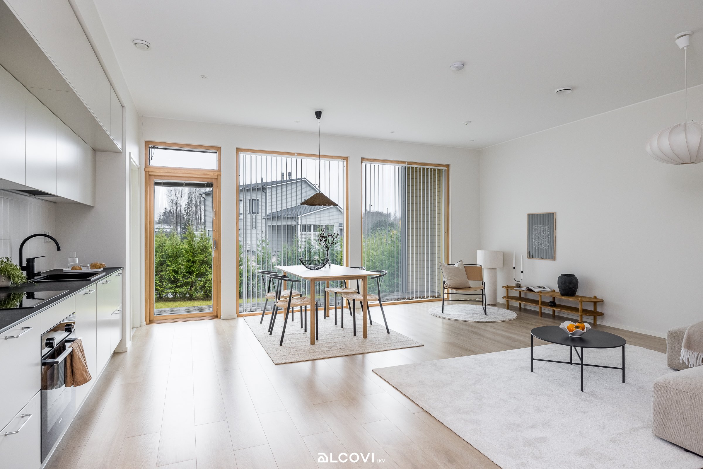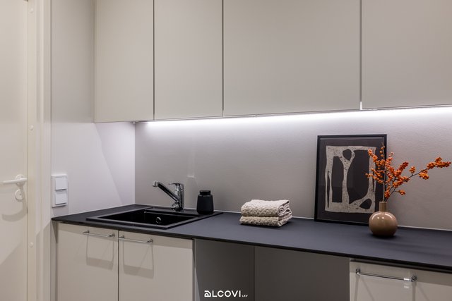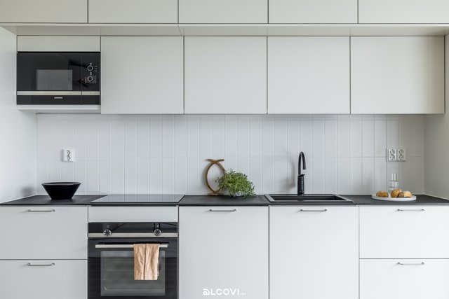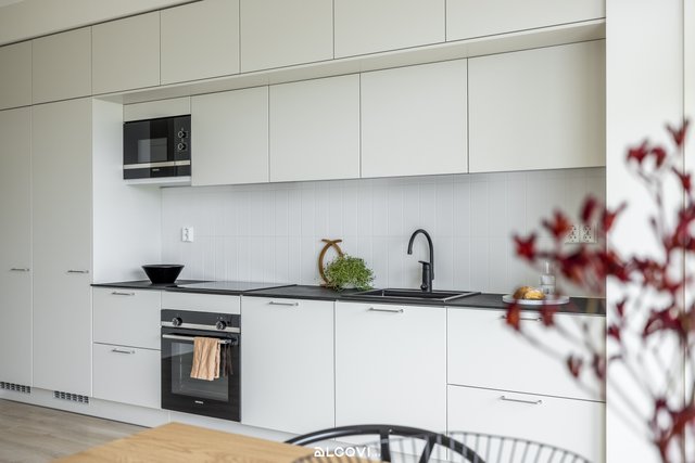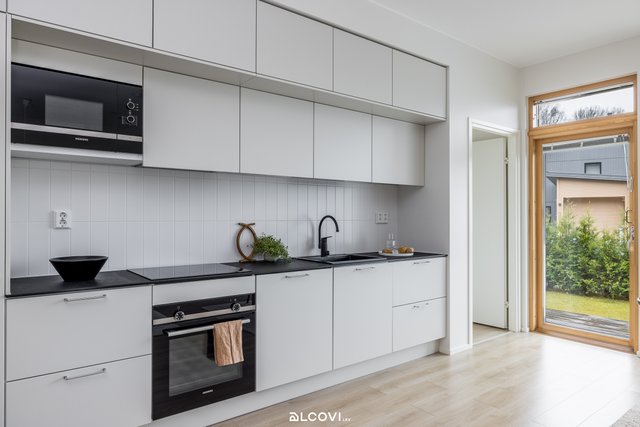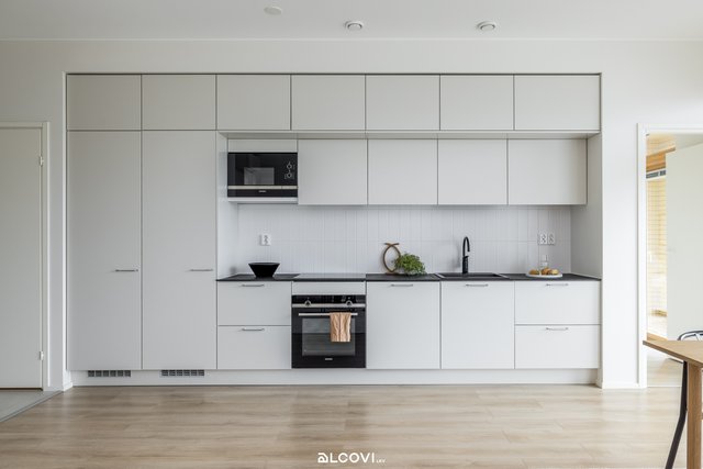 - Avokeittiön (Ilona-keittiöt) varustukseen kuuluvat Siemens-merkkiset integroidut kodinkoneet: induktioliesitaso, liesituuletin, kalusteuuni, mikroaaltouuni, astianpesukone, jääkaappi ja pakastin. Työtaso on kompaktilaminaattia (Eco Musta lohko, 0080SX), välitila kaakelia. Yläkaappien alla led-valaistus. Lattia on laminaattia (Trendy Pro Beige Oak), seinät maalatut. Katossa upotetut led-spotit. Lattialämmitys (vesikiertoinen).