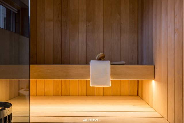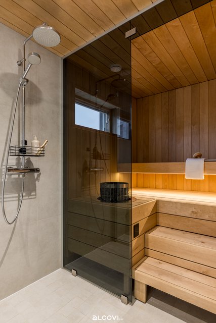 - Harvia Cilindro-pylväskiuas, sähkö, upotettu lauteisiin. Kiukaalle Xenio-ohjauspaneeli. Lauteet tervaleppää. Lattia on laattaa (Betontech 10x10, White Rect), seinät ja katto paneloitu (tervaleppä). Ikkuna ulos. Lattialämmitys (vesikiertoinen).