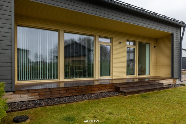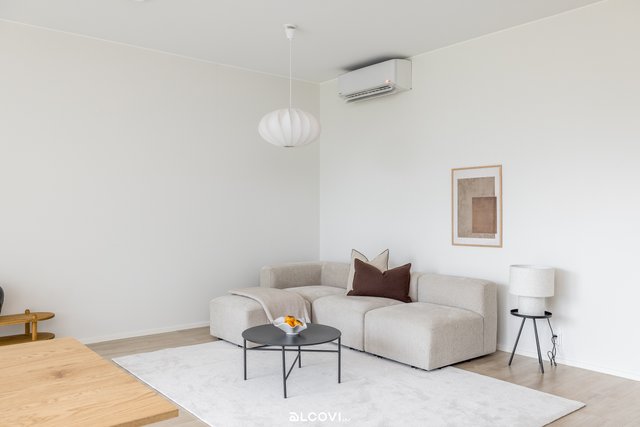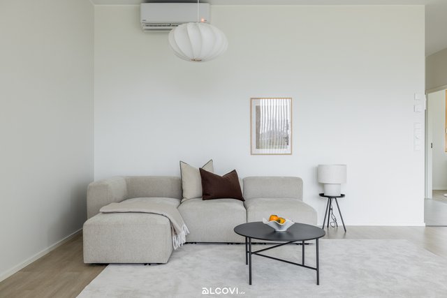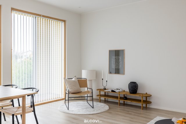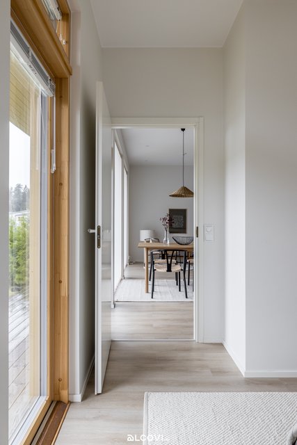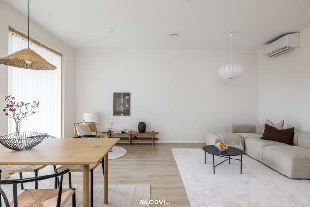 - Olohuoneen lattia on laminaattia (Trendy Pro Beige Oak), seinät maalatut. Ilmalämpöpumpun sisäyksikkö. Kulku terassille. Lattialämmitys (vesikiertoinen).