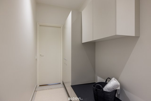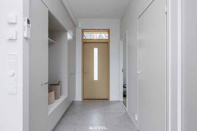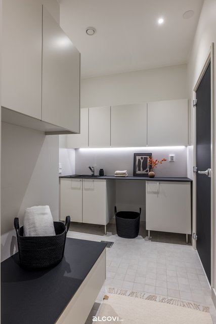 - Kodinhoitohuoneen varustukseen kuuluu kiintokaapistoa (Ilona-keittiöt), vesipiste, pyykinpesukoneliitäntä ja tilavaraus pyykinpesukoneelle. Lattia on laattaa (Betontech 10x10, White Rect), seinät maalatut. Katossa upotetut led-spotit. Lattialämmitys (vesikiertoinen).