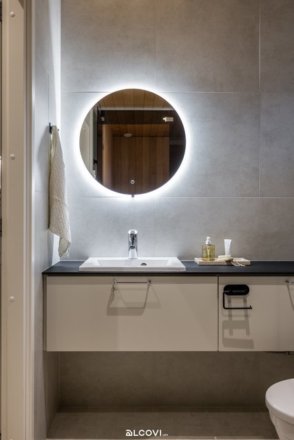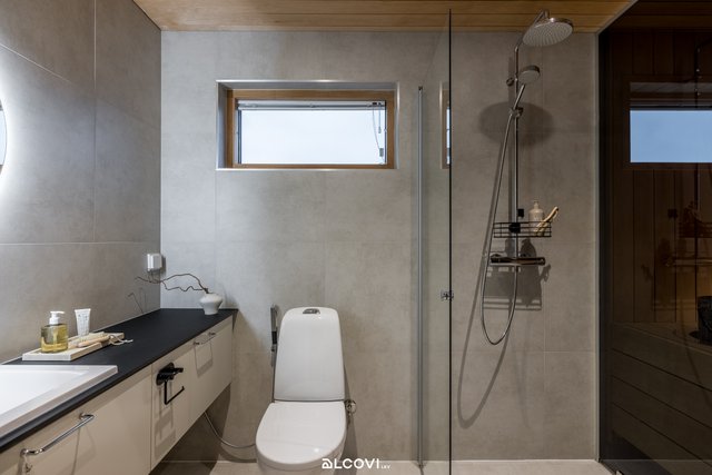- Kylpyhuoneen varustukseen kuuluu allaskaappi (Ilona-keittiöt), pyöreä peili, suihku, lasinen kääntyvä suihkuseinä, wc-istuin ja bidee-suihku. Lattia on laattaa (Betontech 10x10, White Rect), seinät laattaa (Betontech 60x60, White Matt Rect) ja katto paneloitu (tervaleppä). Katossa upotetut led-spotit. Ikkuna ulos. Lattialämmitys (vesikiertoinen).