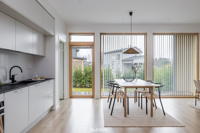 Tämä viihtyisä, yksitasoinen paritalokoti hurmaa valoisuudellaan, laadukkailla