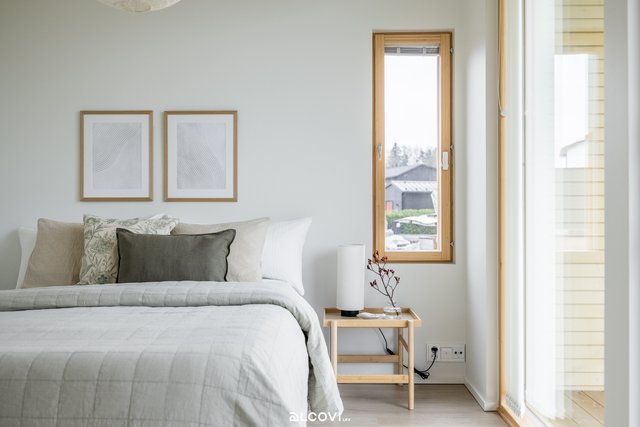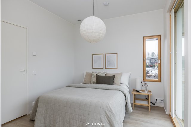- Makuuhuoneita on 2 kpl. Lattiat on laminaattia (Trendy Pro Beige Oak), seinät maalatut. Lattialämmitys (vesikiertoinen). Päämakuuhuoneesta kulku kodinhoitohuoneeseen ja terassille.