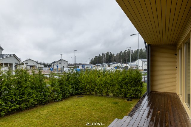 Helppohoitoinen, kompakti piha-alue on viimeistelty nurmella ja ikivihrein tuijin. Katetulla terassilla sopii mukavasti viettämään kesäpäiviä. Pysäköintiin löytyy hyvin tilaa, myös katoksen alta.