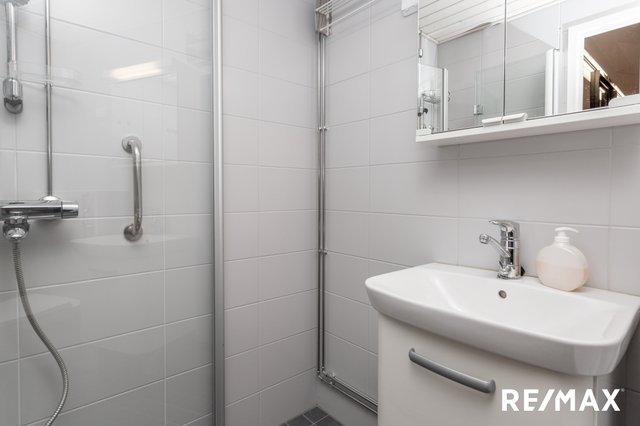 - WC-istuin, suihku, suihkuseinä, pesukoneliitäntä, lattialämmitys, peilikaappi, allaskaappi, ja pesuallas