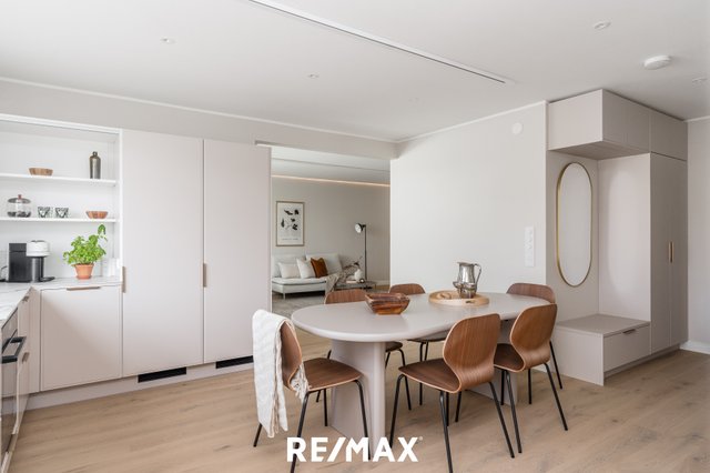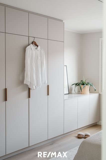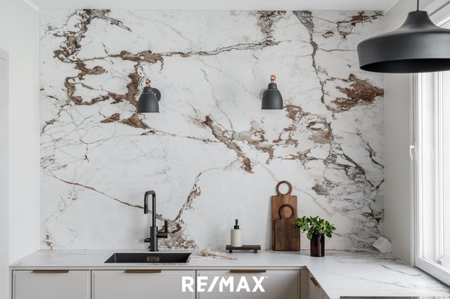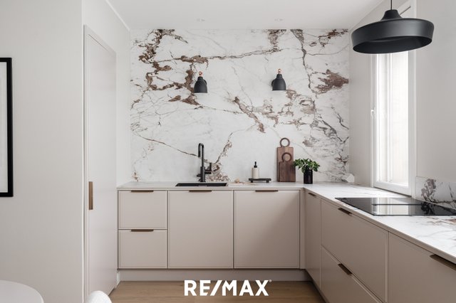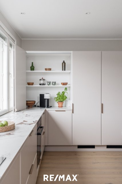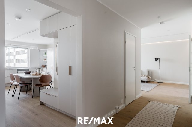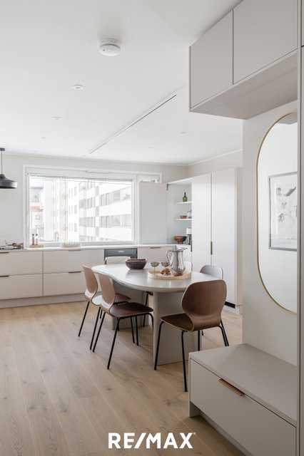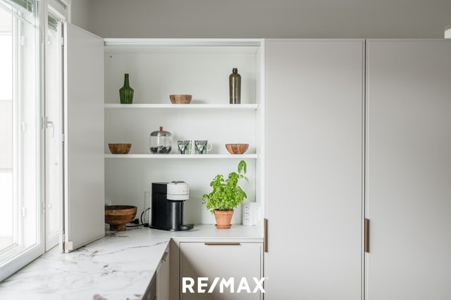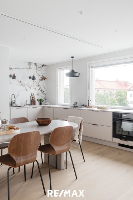 Keittiö on varustettu laadukkailla Puustellin kalusteilla ja kivitasoilla. Asunnon laadukkaat parkettilattiat ja maalatut seinät luovat modernin ja tyylikkään ilmeen.