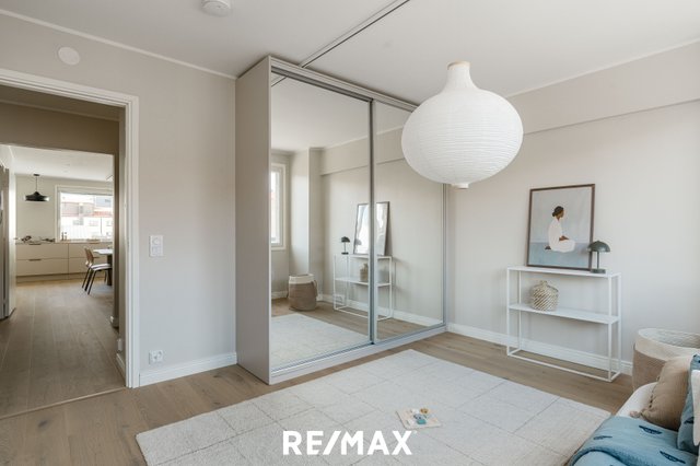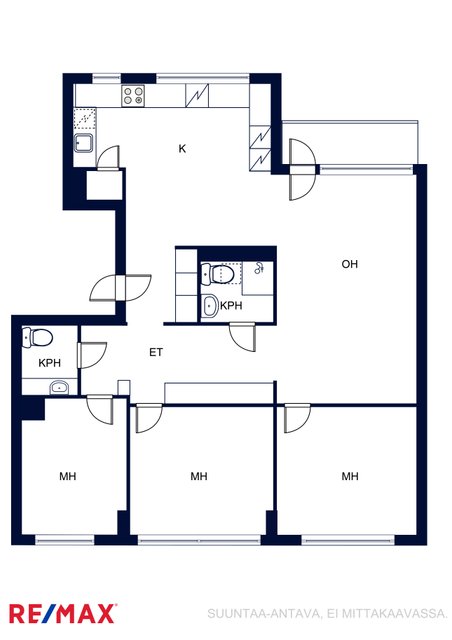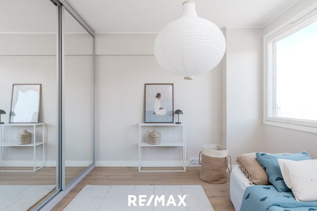 Asunnossa on kolme makuuhuonetta, tilava olohuone sekä kaksi kylpyhuonetta, joista toisessa on suihku ja toisessa pesukoneliitäntä.