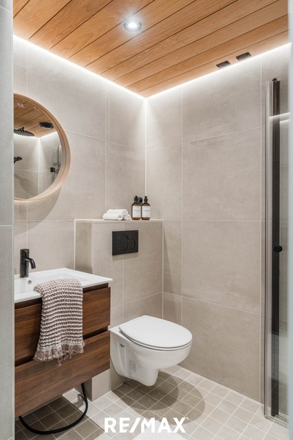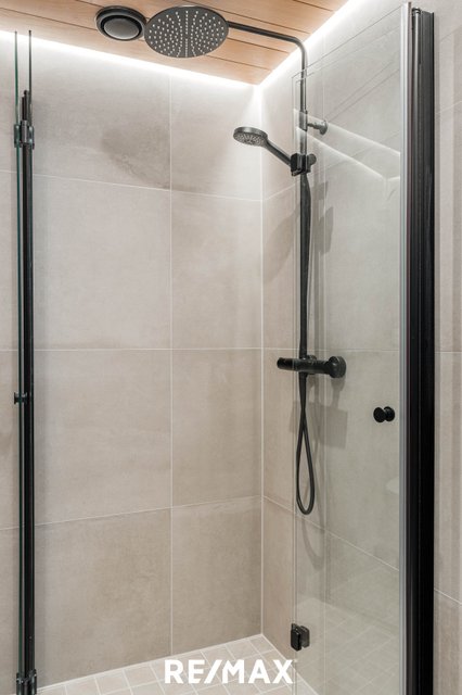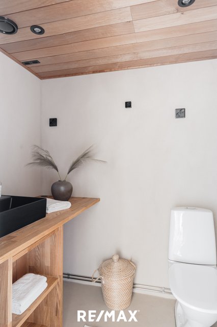 - Toisessa kylpyhuoneessa on suihku ja toisessa pesukoneliitäntä sekä seinässä ja lattiassa mikrosementti.