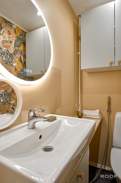 - Suihku, suihkuseinä, wc-istuin, pesukoneliitäntä, peilikaappi, lattialämmitys (sähkö), ja bidee-suihku