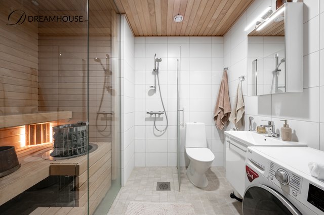 - WC-istuin, suihkuseinä, pesukoneliitäntä, peilikaappi, pesuallas, allaskaappi, lattialämmitys, ja bidee-suihku