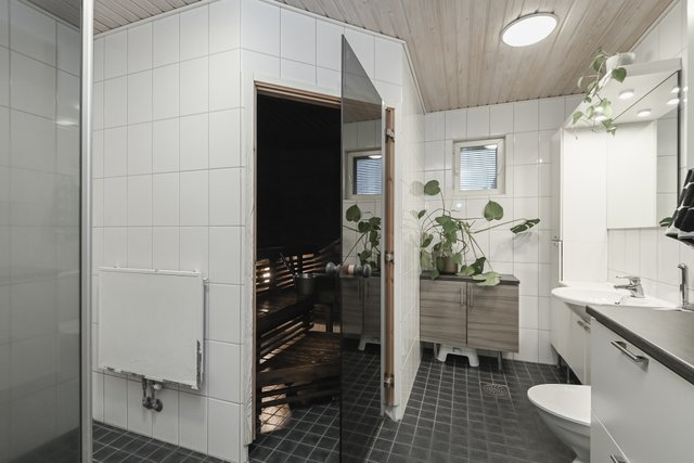 Erillinen wc helpottaa arkea ja mahdollistaa aamutoimien mutkattoman sujumisen. Kodin kylpyhuone- sekä saunatilat ovat tilavat ja sinne on sijoitettu myös kodin toinen wc. Niin kylpyhuoneessa kuin erillisessä wc:ssä on lattialämmitys. Taloyhtiö on valmistunut vuonna 2006 ja lämpenee tutulla sekä turvallisella kaukolämmöllä. Asunnolle kuuluu lisäksi lämmin varasto sekä autokatospaikka.