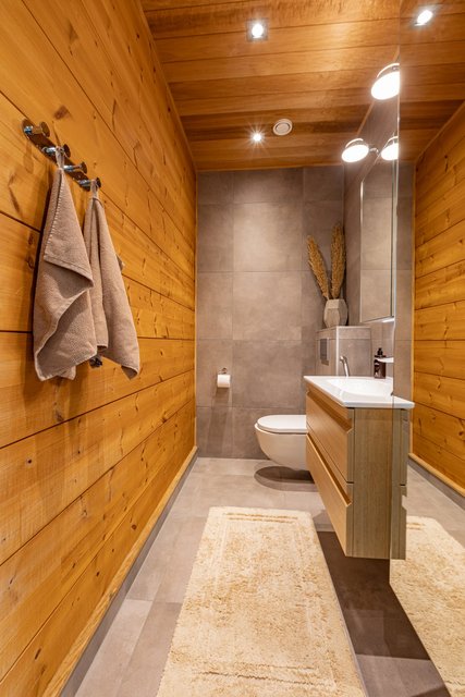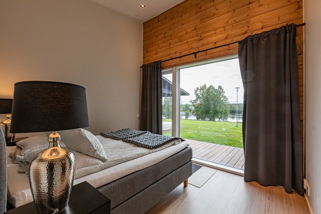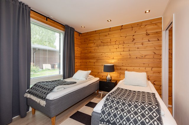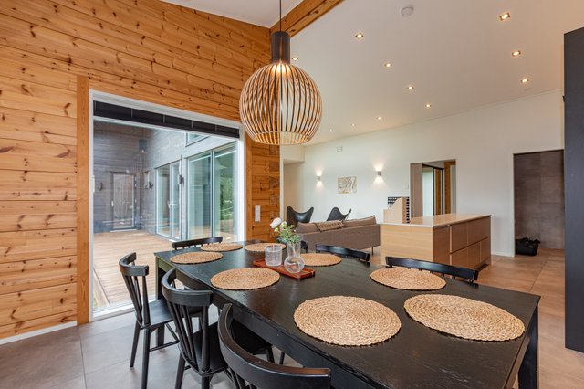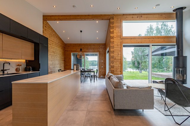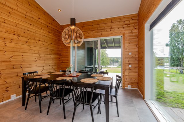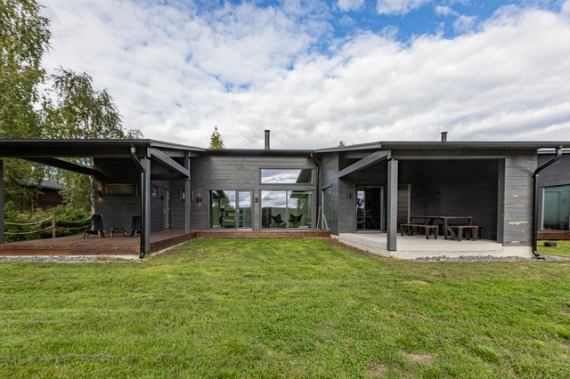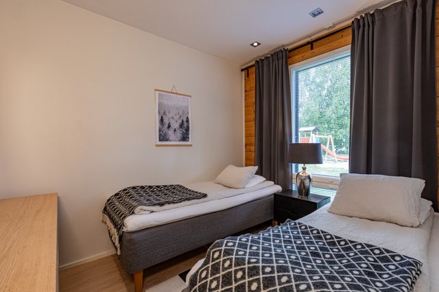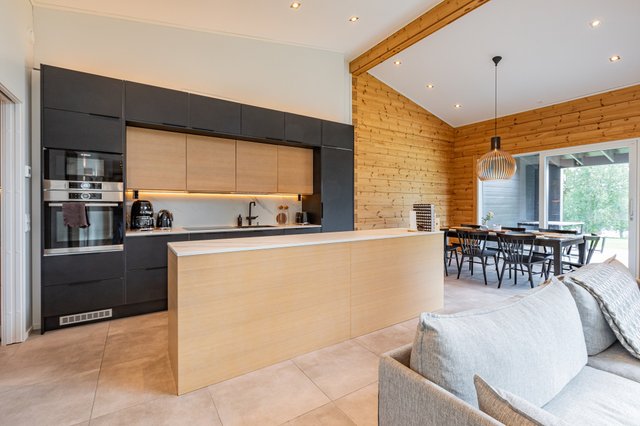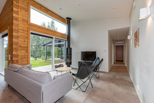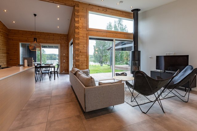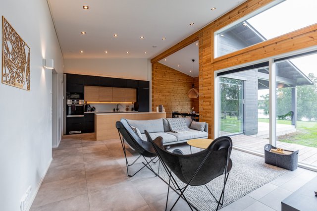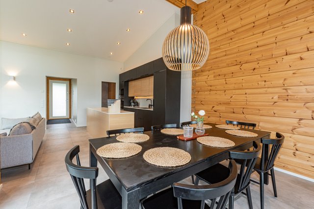 Asunnossa on neljä makuuhuonetta, tilava olohuone ja erillinen ruokailutila, jotka luovat avaran ja valoisan kokonaisuuden. Laadukkaat materiaalit, kuten vinyylilankku lattiat ja hirsiseinät, tuovat lämpöä ja kodikkuutta. Moderni keittiö on varusteltu kattavasti, ja sauna sähkökiukaalla tarjoaa rentouttavat löylyt.