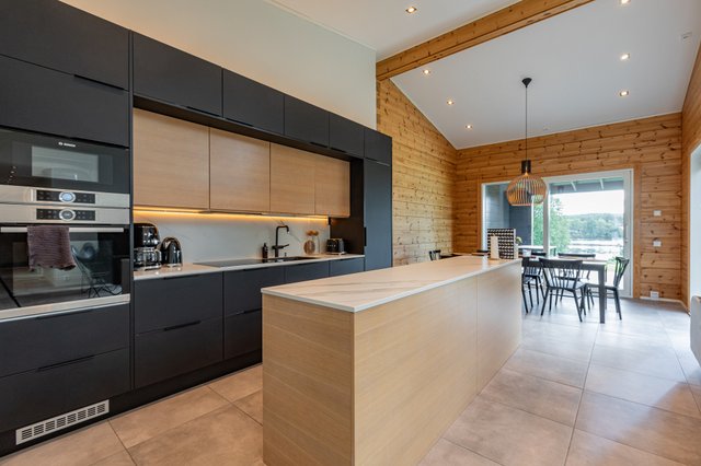 - Jääkaappipakastin, erillisuuni, liesituuletin, astianpesukone, mikroaaltouuni, ja keittiösaareke