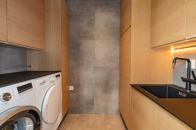 - Pesukone, kuivausrumpu, pesukoneliitäntä, lattialämmitys, lattiakaivo, pyykkikaapit, pöytätaso, ja pesuallas