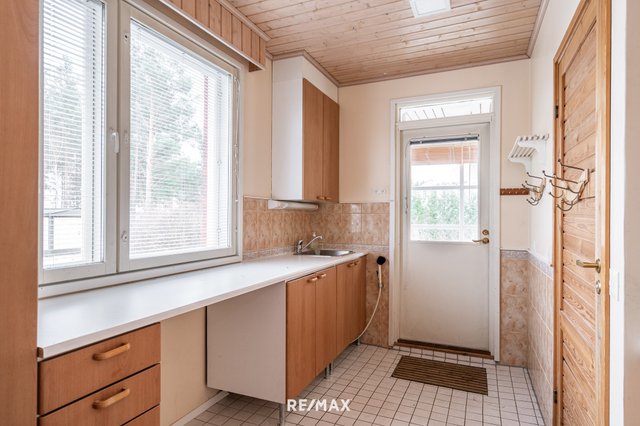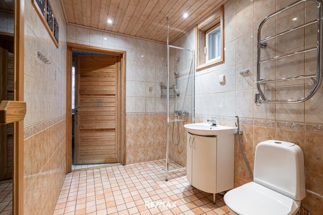 Kylpyhuoneessa ja saunassa on mukavuuksia, kuten lattialämmitys, joka tuo lisälämpöä kylminä talvipäivinä. Talosta löytyy myös kodinhoitohuone, jossa on oma uloskäynti, mikä helpottaa arjen askareita.