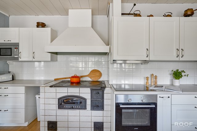 - Jääkaappipakastin (2 kpl), liesi (2025), erillisuuni, liesituuletin, mikroaaltouuni, astianpesukone, ja puuhellaleivinuuni