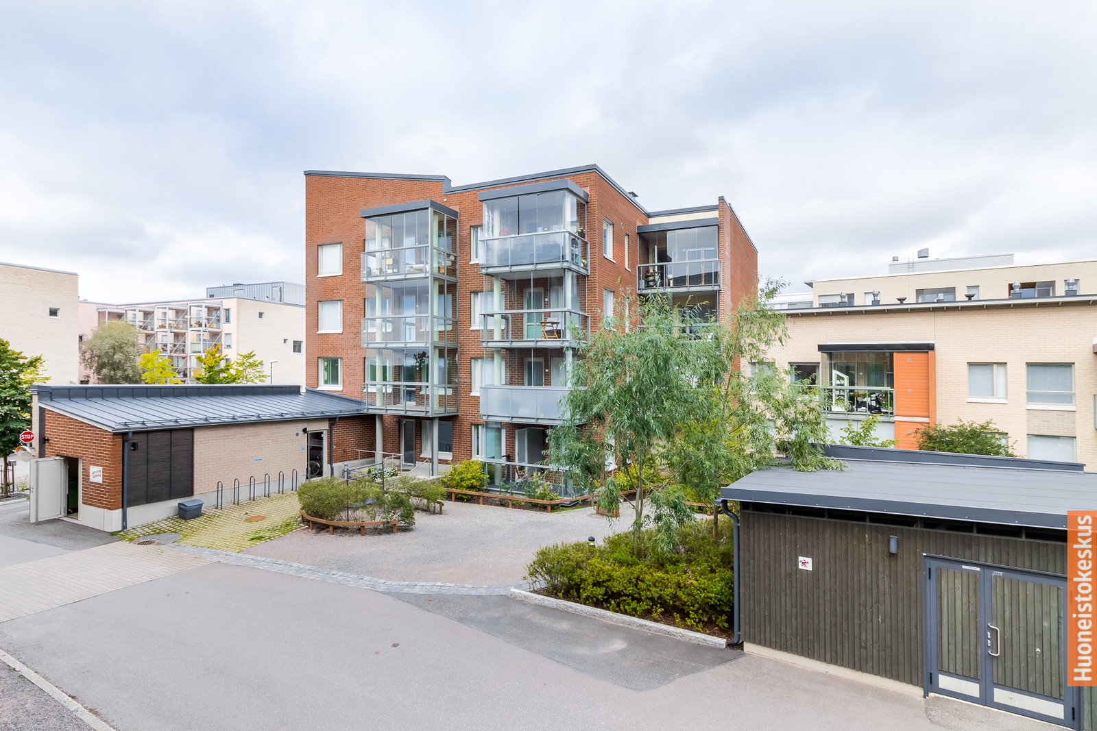 Tässä valoisassa asunnossa on tyylikäs avokeittiö ja olohuone, makuuhuone, tilava kylpyhuone ja sauna. Lasitetulla parvekkeella on tilaa parvekekalusteille.
