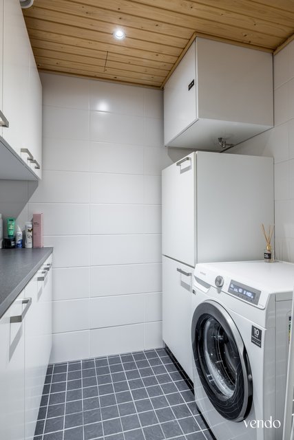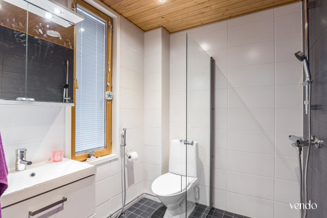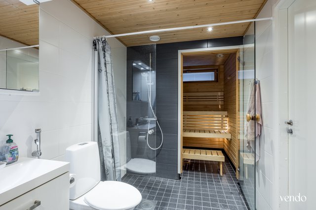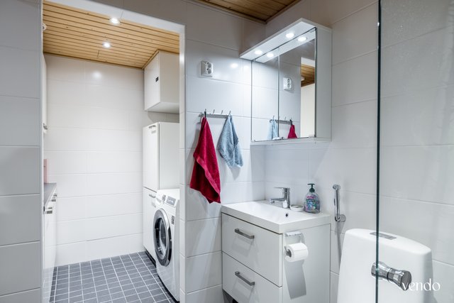 - WC-istuin, suihku, suihkuseinä, pesukoneliitäntä, lattialämmitys, ja peilikaappi