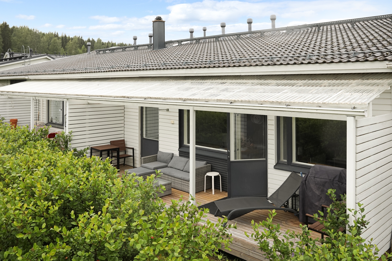 Asunnon etelään suuntautuvalta, valokatteella varustetulta terassilta avautuu suojaisa piha-alue – täydellinen paikka nauttia aamukahveista tai viettää kesäiltoja grillaten.