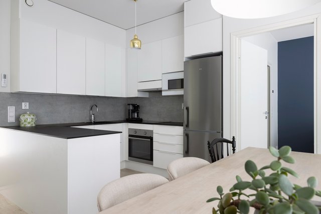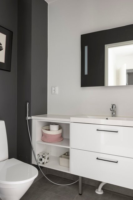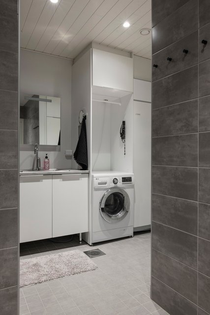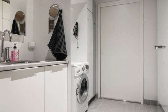 - Pesukoneliitäntä, lattialämmitys, pesuallas, pöytätaso, ja tila pesutornille