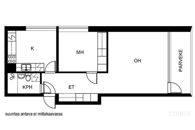 Asunnon keittiö on hiljattain uusittu, ja se tarjoaa erinomaiset puitteet kokkailuun. Lattiat ovat pääosin parkettia, mikä tuo kotiin lämpöä ja tyylikkyyttä. Pohjaratkaisu on toimiva ja tilat hyvin käytetyt.