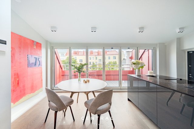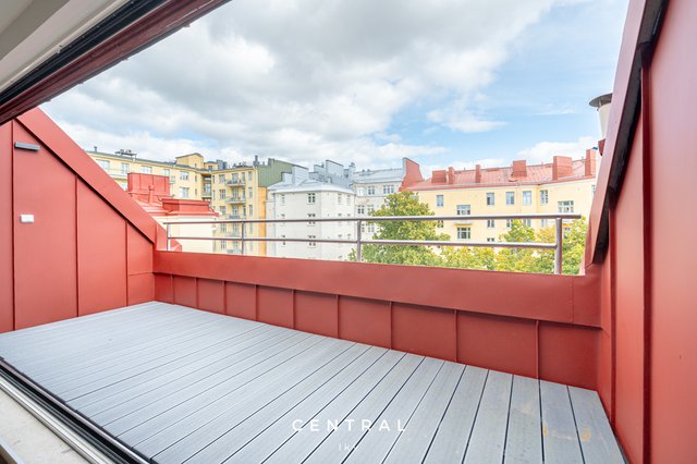 Näyttävän jugendrakennuksen tasokas kattohuoneisto isolla terassiparvekkeella, ydinkeskustan tuntumassa