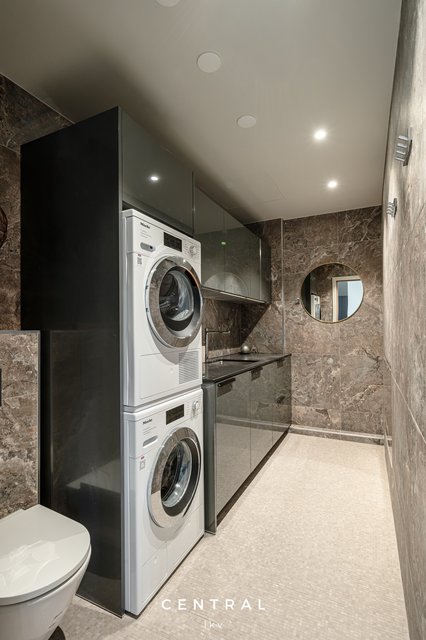 - Tilava kodinhoitohuone, jossa tilaa pesutornille ja myös runsaasti kaappi- ja laskutilaa.
