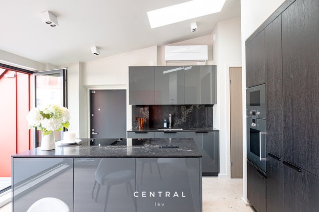 - Laadukas saarekkeellinen avokeittiö, jonka koko seinän mittaiset liukulasiovet avautuvat isolle terassiparvekkeelle, josta näkymät taloyhtiön sisäpihalle. Korkeatasoiset integroidut Gaggenaun kodinkoneet ja Poggenpohl-malliston keittiökalusteet, ovet HL Diamond grey High Gloss / FG Dark Oak tammiviilua. Rungot Stone Grey / Logo decor white ja vetimet M129 Shell handle black. Työtasot kvartsia, Ceasarstone Vanilla Noir (kivi). Teräsallas Blanco Andano 500-U, Hana Lapetek Lino A, saarekkeen pistorasiat Savo Voltti, musta. Altaan yläpuolella olevan kuivauskaapin tippakaukalo on RST kuivauskaapin hyllysarjaa. Lattiat ABL Provenza-Ego 60x60 laattaa.
