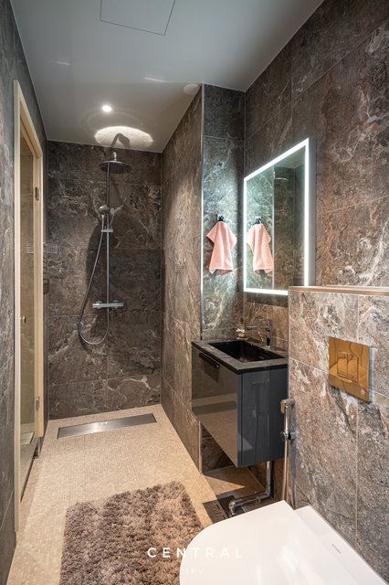 - WC-istuin (Duravit Starck 3), suihku (Sadesuihku Gessi Rettangolo-mallia), peili (Evo alumiinikehyspeili ledvaloilla), pesuallas (BathCo posliiniallas kvartsitasolla), ja allaskaappi (HL Diamond Grey High Gloss.)
