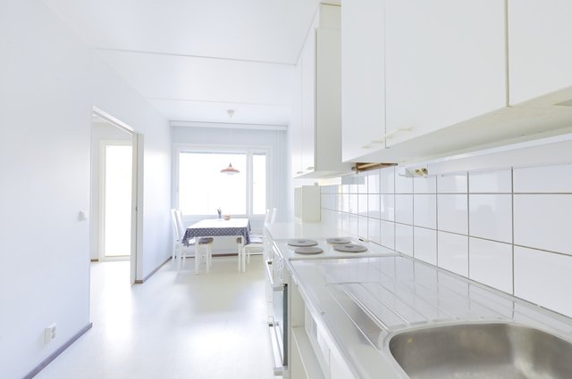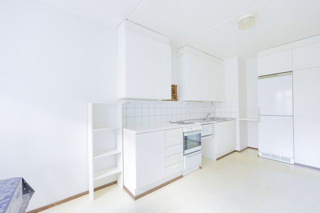 - Valkoiset kaapistot ja laatikostot. Kodinkoneet: jää/pakastinkaappi, liesi/uuni ja mikro. Lattiassa muovimatto.