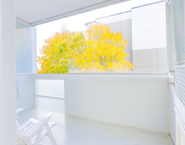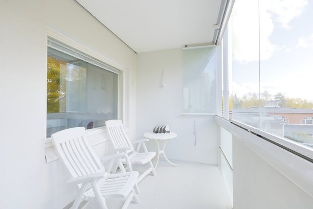 Asunnossa on tilava olohuone, josta on käynti lasitetulle parvekkeelle, missä voit nauttia iltapäivän auringosta.