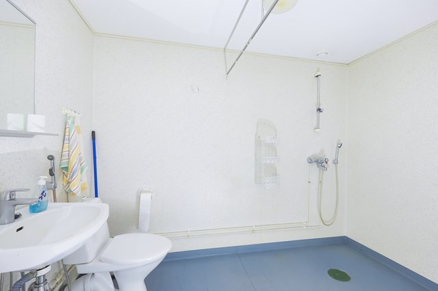 - WC-istuin, suihku, pesukone, pesukoneliitäntä, peili, pesuallas, hana ja seinähyllykkö, ja bidee-suihku
