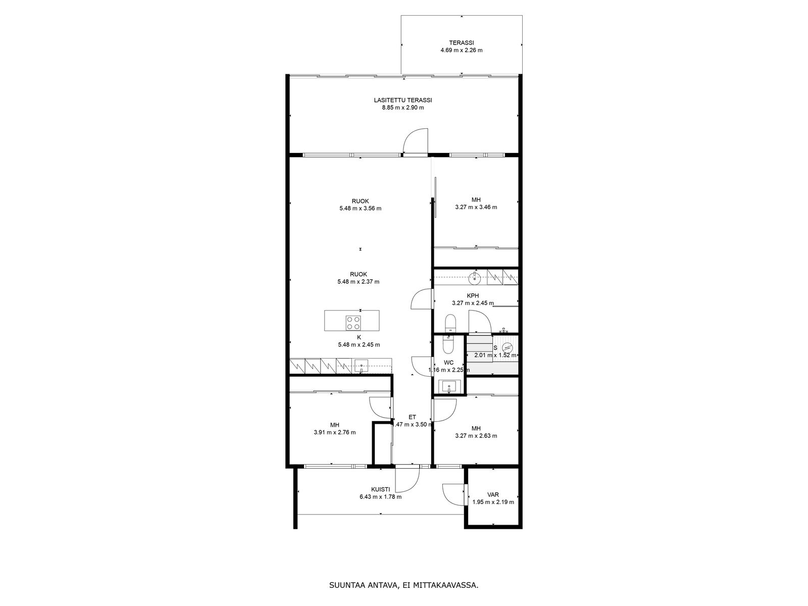 Kolme makuuhuonetta tarjoavat runsaasti mahdollisuuksia isommallekin perheelle tai vaikkapa etätyöskentelyyn. Kodin sydän on suuri, lasitettu terassi, joka avautuu ilta-auringon suuntaan – täydellinen paikka nauttia rauhallisista illoista ja yhteisistä hetkistä.