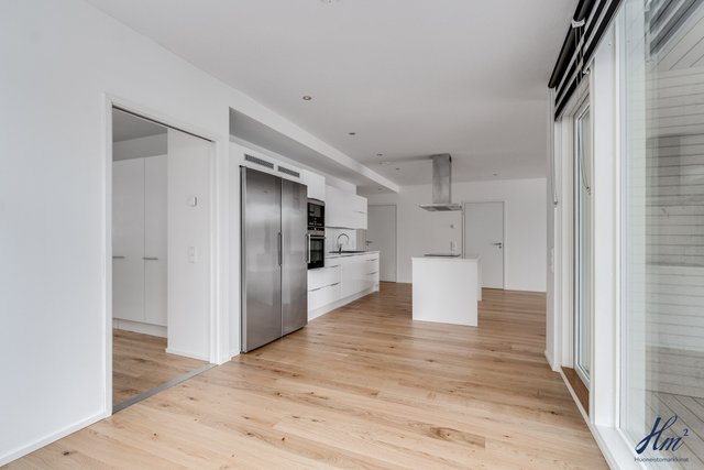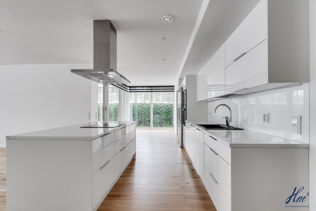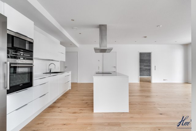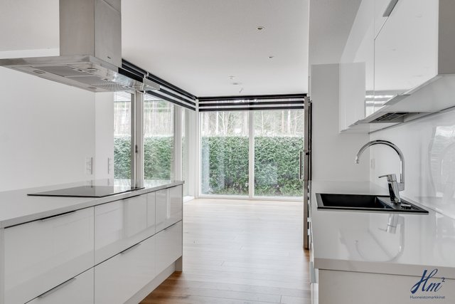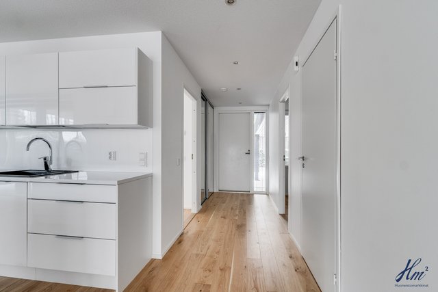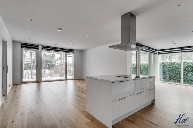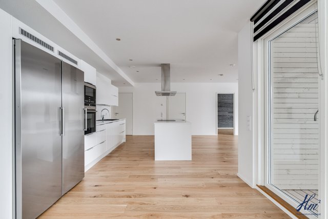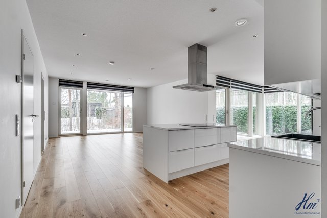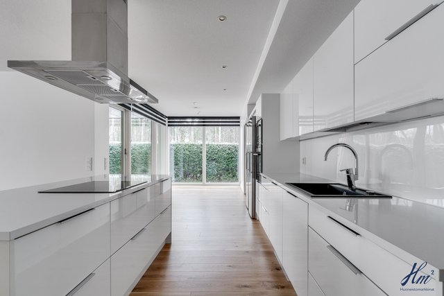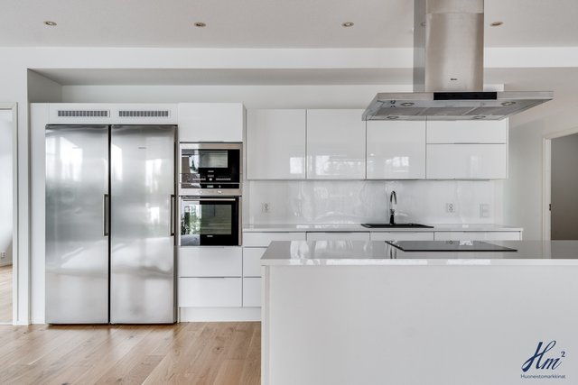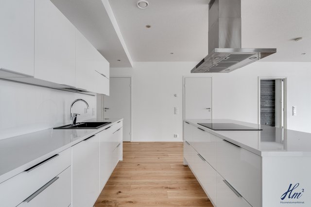 - Keittiön varusteina jääkaappi, pakastin, erillisuuni, induktioliesi, liesituuletin, mikroaaltouuni, astianpesukone ja keittiösaareke. Lattia parkettia.