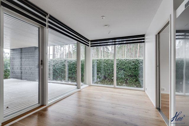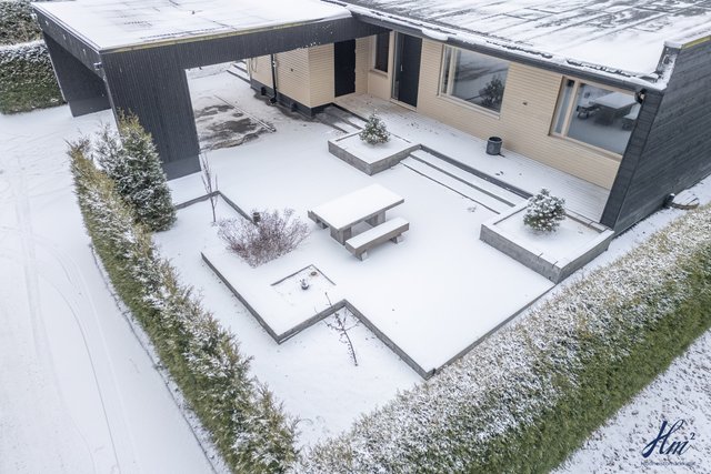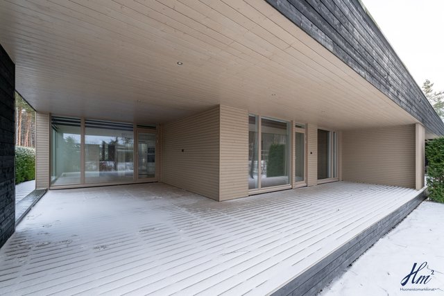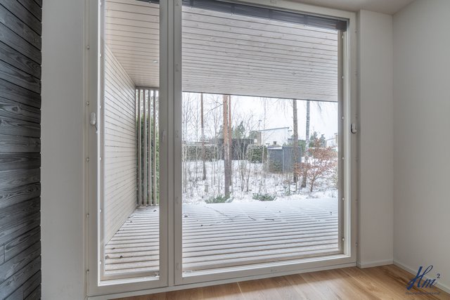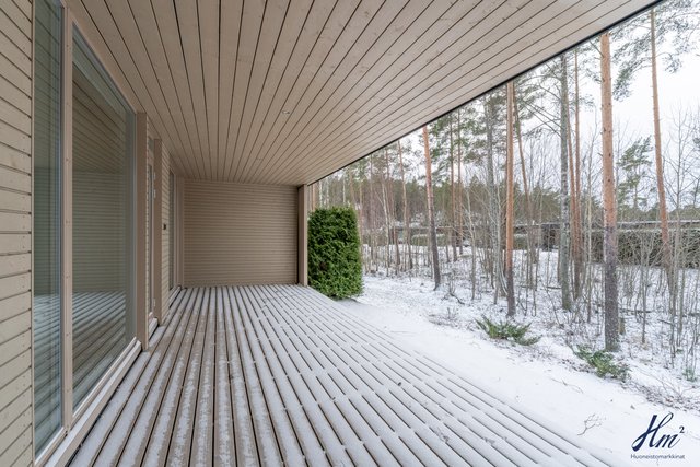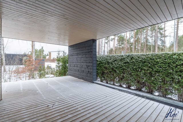 - Etupihalla iso terassi, sekä kivetystä. Takapihalla iso katettu terassi koko huoneiston kulman ympäri.