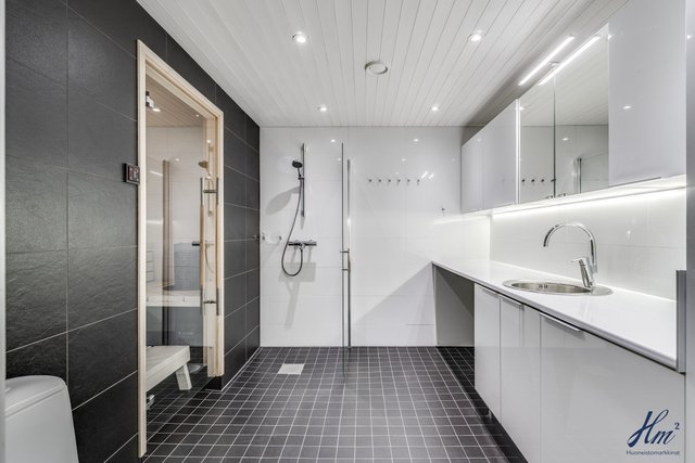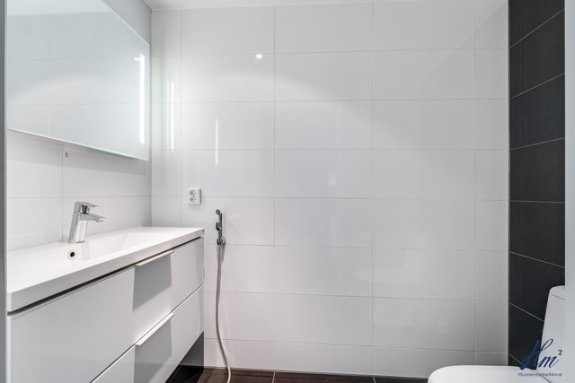 - Kylpyhuoneen varusteina wc-istuin, suihku, suihkuseinä, peilikaappi, allaskaappi, kaapistoa, pesukoneliitäntä ja lattialämmitys. Lattia laattaa, seinät kaakelia.