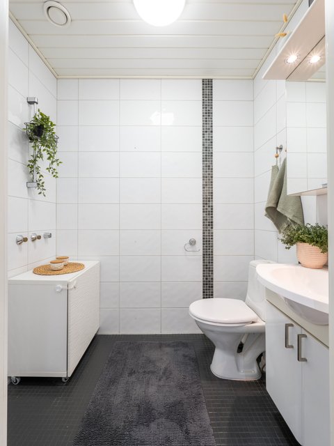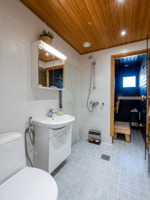 - Lattialämmitys, pesukoneliitäntä, wc-istuin, ja suihku